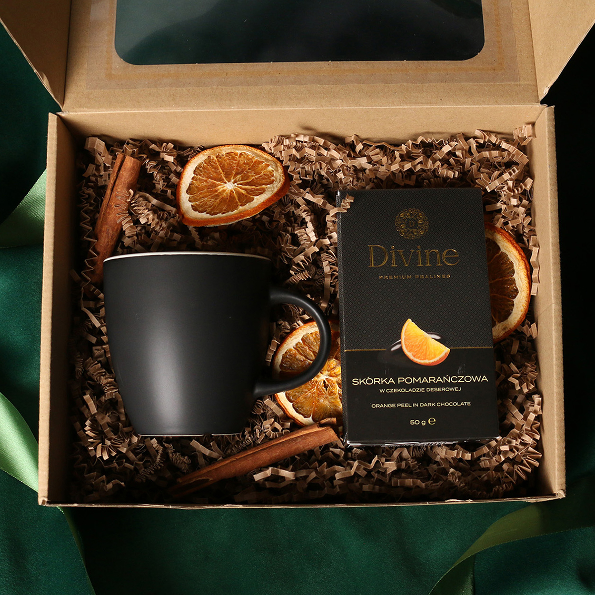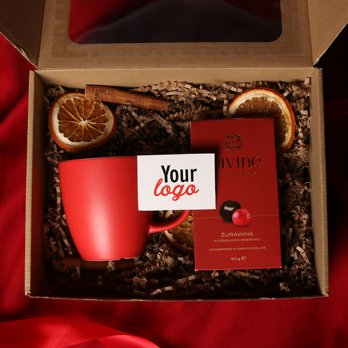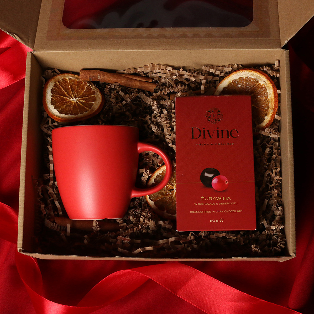 W skład zestawu wchodzą: kubek Fiord czerwono-biały / granatowy-biały / czarny-biały z możliwością zdobienia, Divine Pralines - żurawina w czekoladzie (czerwony) / borówki w czekoladzie (granatowy) / skórka pomarańczy w czekoladzie (czarny) Całość w stylowym opakowaniu z tektury eco z okienkiem. Opcje dodatkowej customizacji: nadruk na kubku, bilecik z logo firmy, wstążka lub obwoluta z motywem zimowym wzbogacona złoceniem