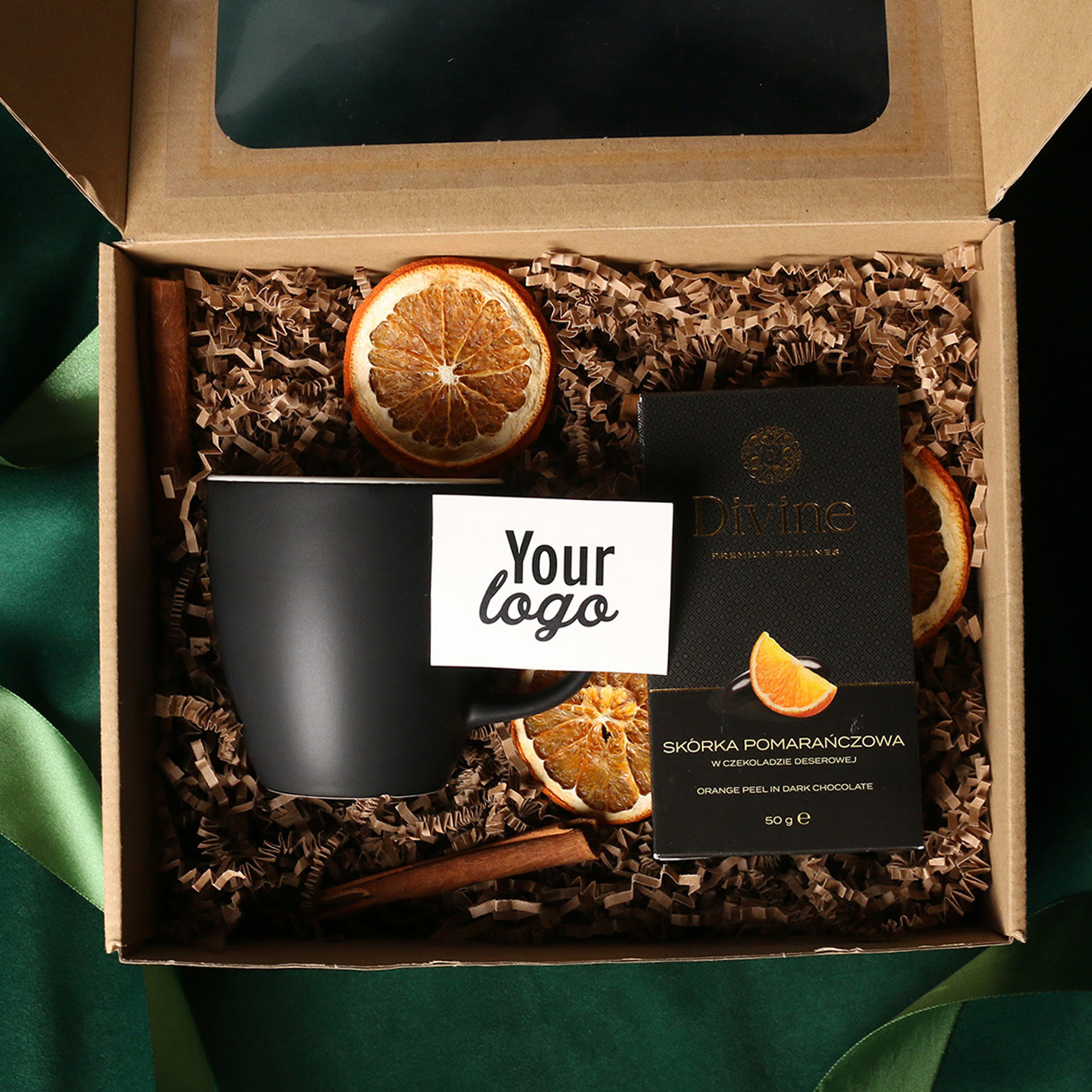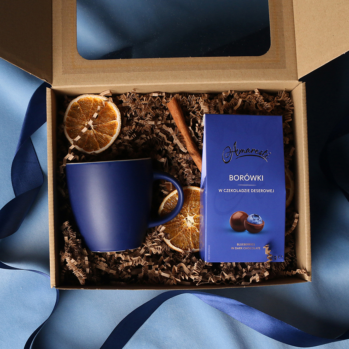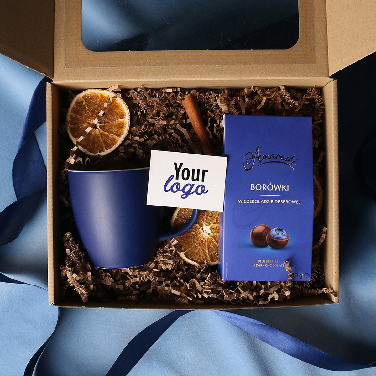 W skład zestawu wchodzą: kubek Fiord czerwono-biały / granatowy-biały / czarny-biały z możliwością zdobienia, Divine Pralines - żurawina w czekoladzie (czerwony) / borówki w czekoladzie (granatowy) / skórka pomarańczy w czekoladzie (czarny) Całość w stylowym opakowaniu z tektury eco z okienkiem. Opcje dodatkowej customizacji: nadruk na kubku, bilecik z logo firmy, wstążka lub obwoluta z motywem zimowym wzbogacona złoceniem